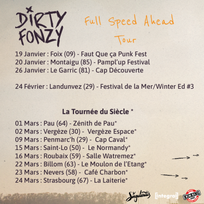 Après la sortie de leur dernier album Full Speed Ahead fin 2023, les DIRTY FONZY attaquent 2024 avec une série de concerts dont La Tournée du Siècle et une release party à La Boule Noire à Paris le 25 avril, aux côtés de Jet Sex et Panic Monster.